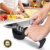 Coloque el afilador en una superficie plana y consistente, con la mano izquierda sujete el mango del afilador, con la mano derecha sujete el cuchillo verticalmente y colóquelo en la ranura en V, utilice la fuerza adecuada para tirar hacia atrás (no empujar hacia adelante) como lo indica la flecha, repita varias veces hasta que el cuchillo se afile, luego coloque el cuchillo verticalmente en la ranura en V de «Molienda fina» para lograr el afilado óptimo del cuchillo.
